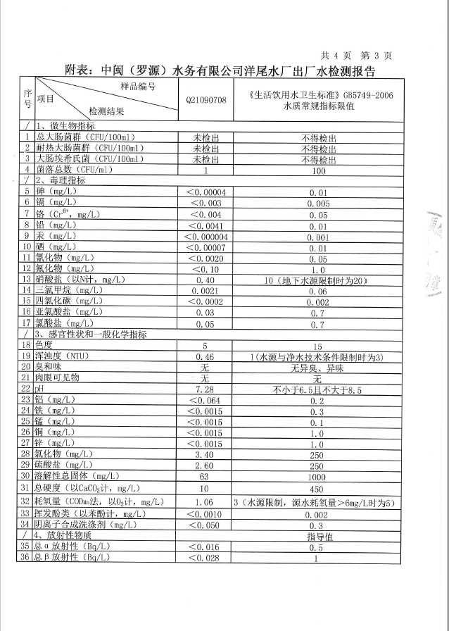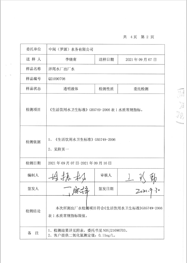 2021年9月洋尾水厂出厂水