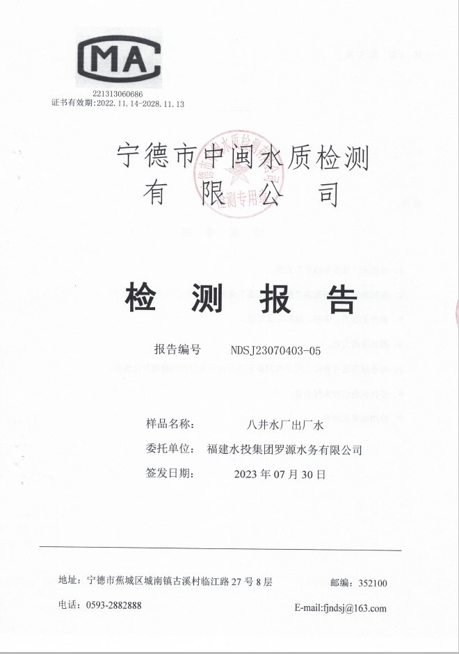 2023年7月八井水厂出厂水水质检测报告