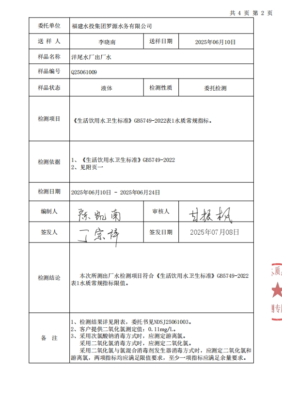 2025年6月洋尾水厂出厂水水质检测报告