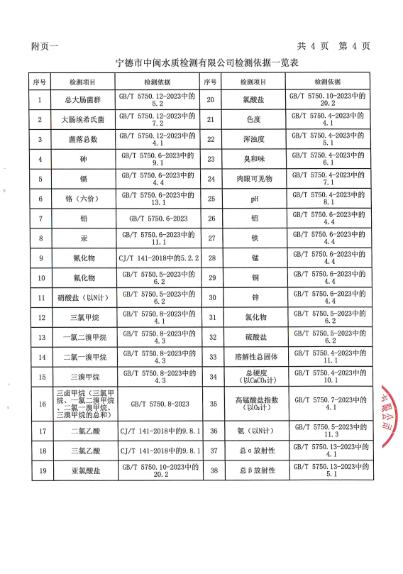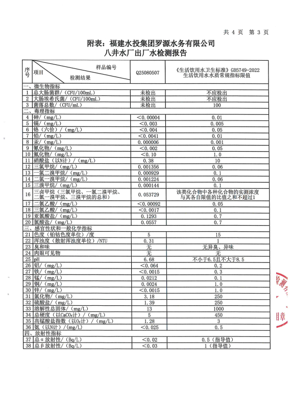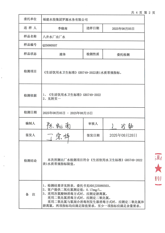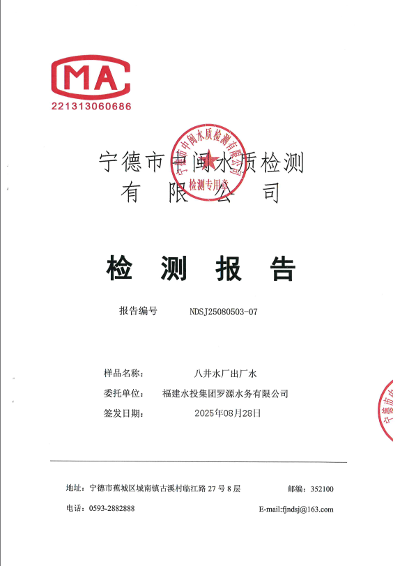 2025年8月八井水厂出厂水水质检测报告
