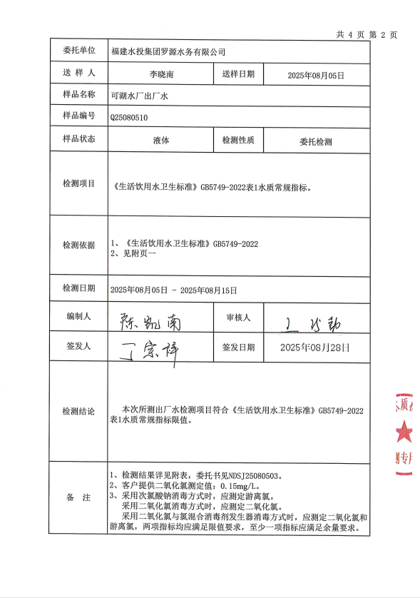 2025年8月可湖水厂出厂水水质检测报告