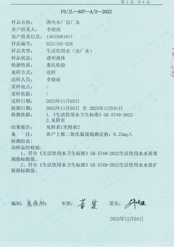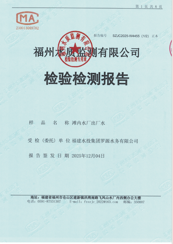 2025年11月滩内水厂出厂水水质检测报告