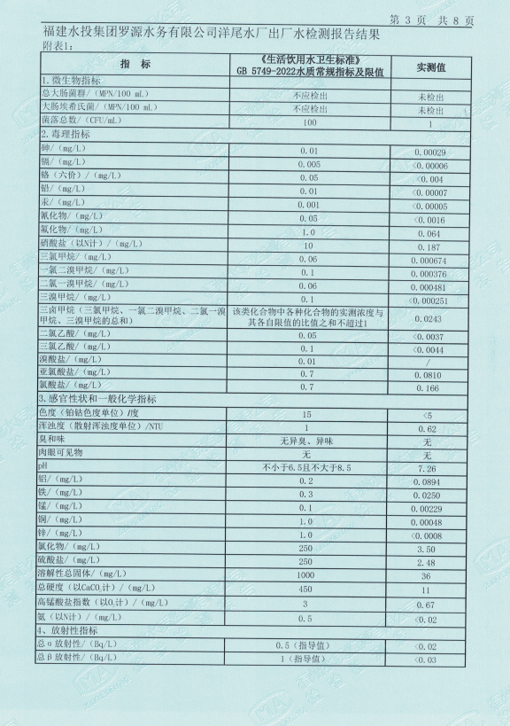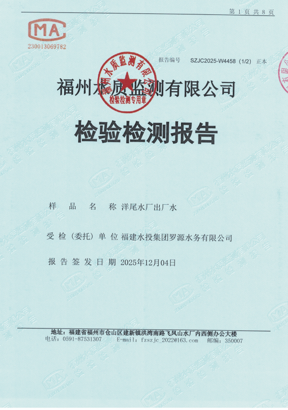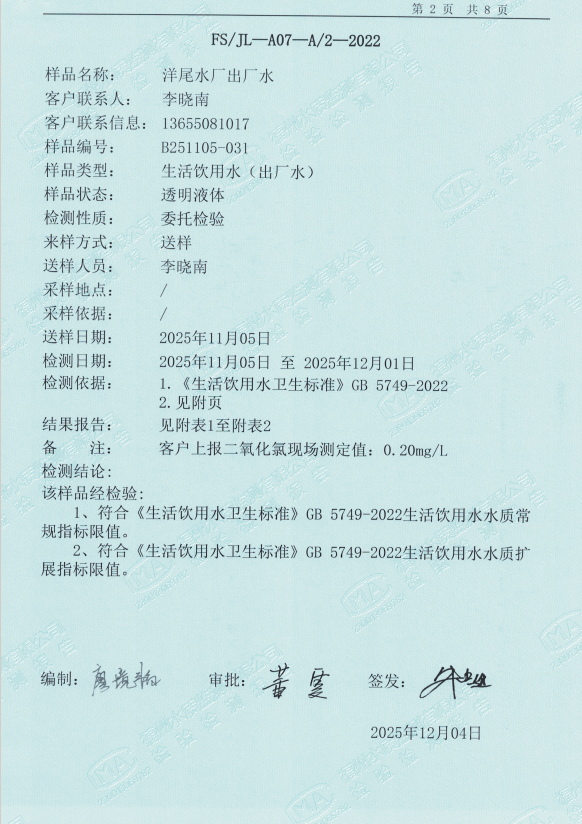 2025年11月洋尾水厂出厂水水质检测报告