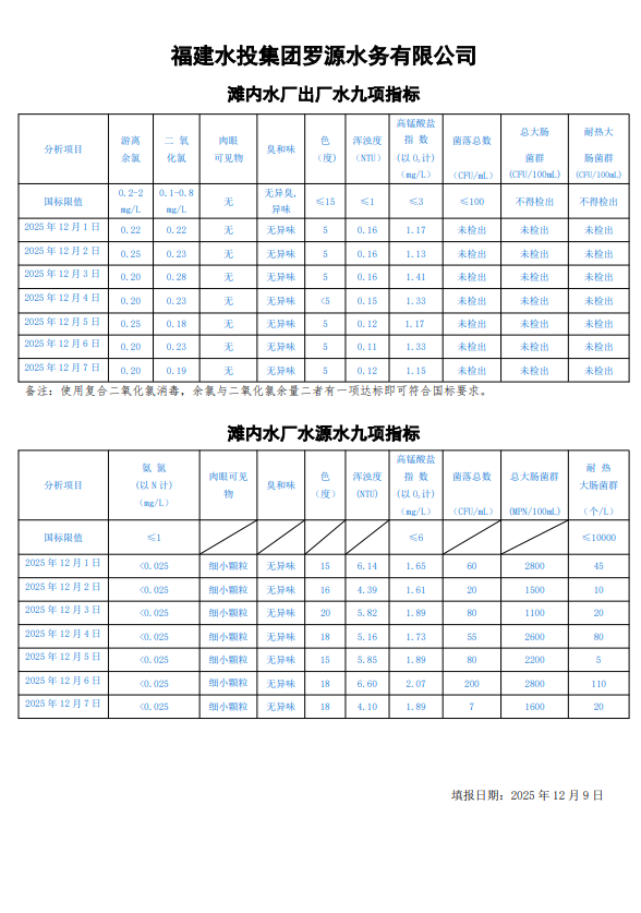 2025年12月1日-2025年12月7日滩内水厂出厂水及水源水九项指标