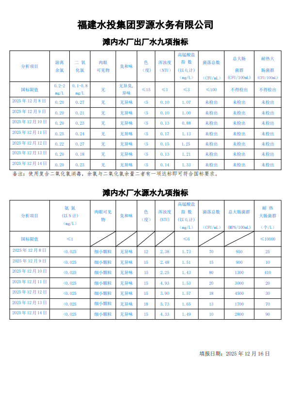 2025年12月8日-2025年12月14日滩内水厂出厂水及水源水九项指标