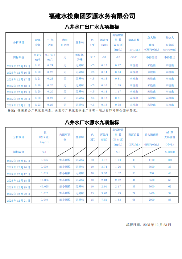2025年12月15日-2025年12月21日八井水厂出厂水及水源水九项指标