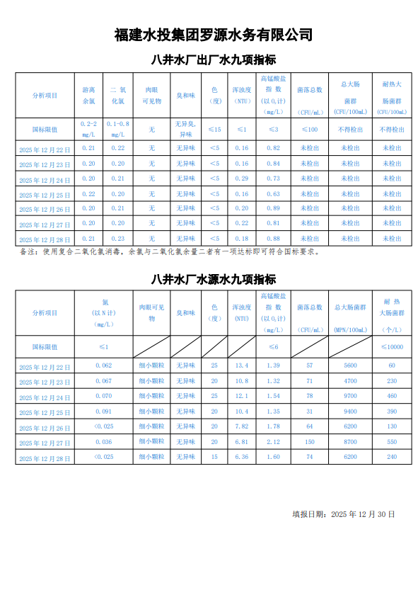 2025年12月22日-2025年12月28日八井水厂出厂水及水源水九项指标