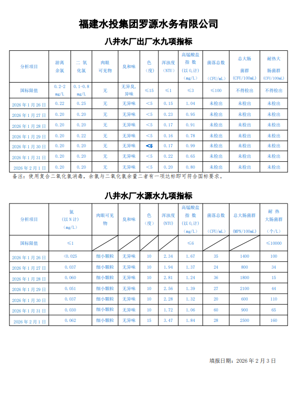 2026年1月26日-2026年2月1日八井水厂出厂水及水源水九项指标