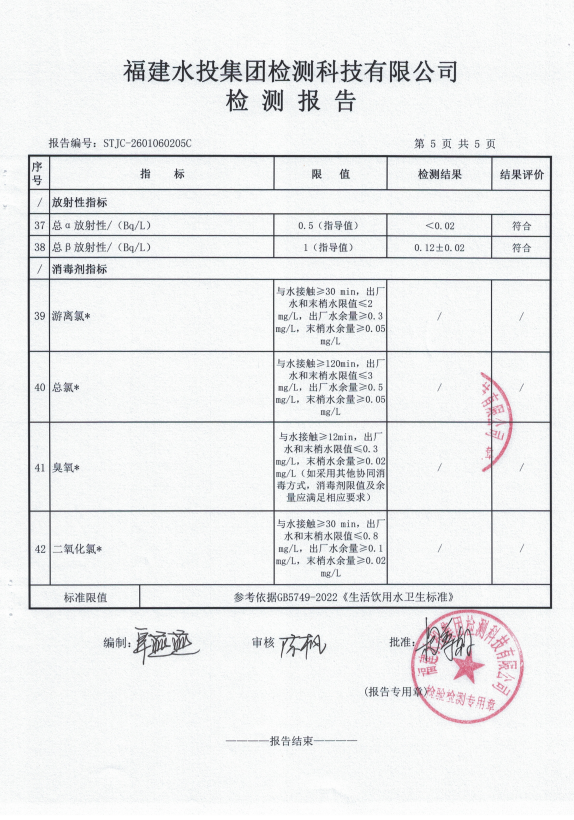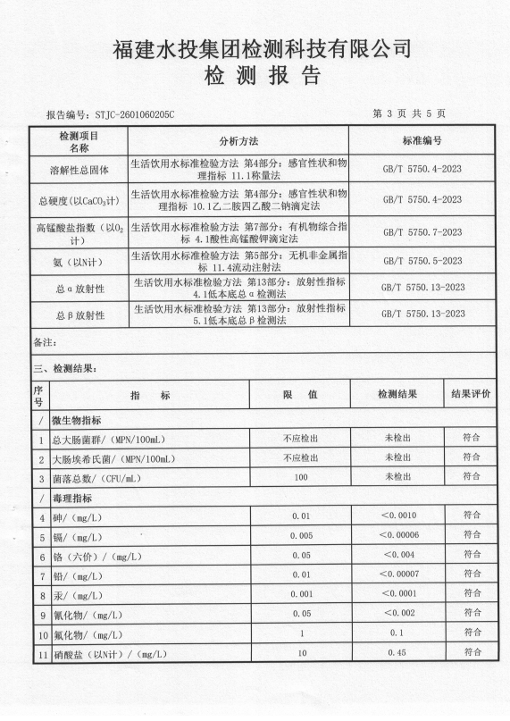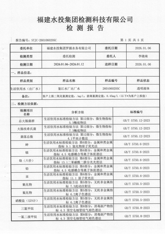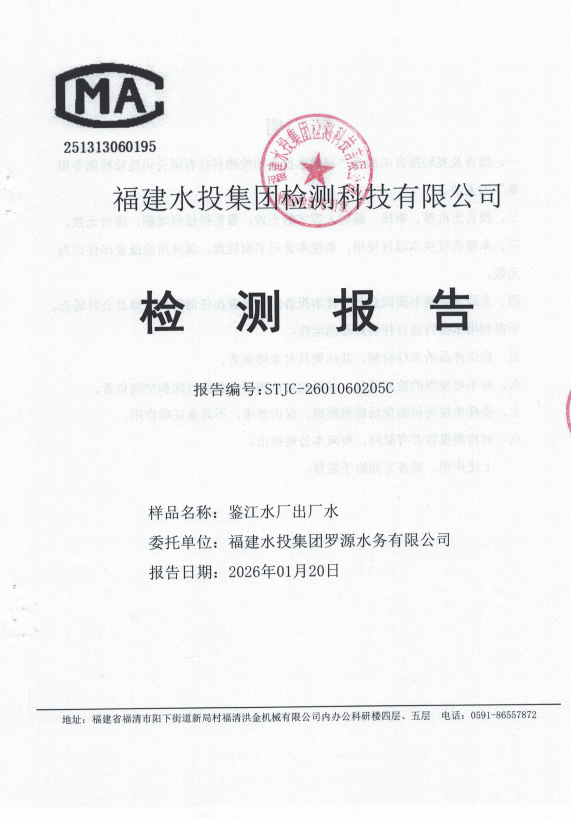 2026年1月鉴江水厂出厂水水质检测报告