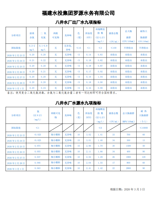 2026年2月23日-2026年3月1日八井水厂出厂水及水源水九项指标