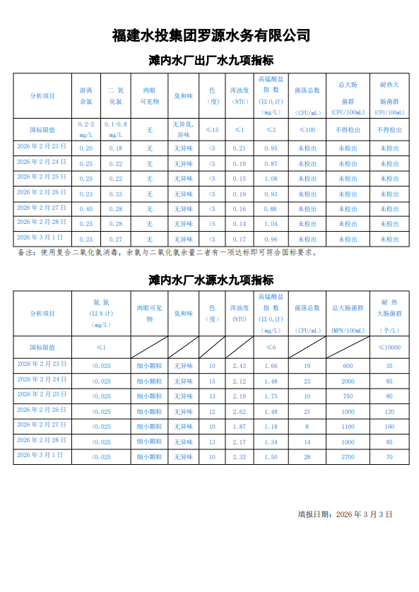 2026年2月23日-2026年3月1日滩内水厂出厂水及水源水九项指标
