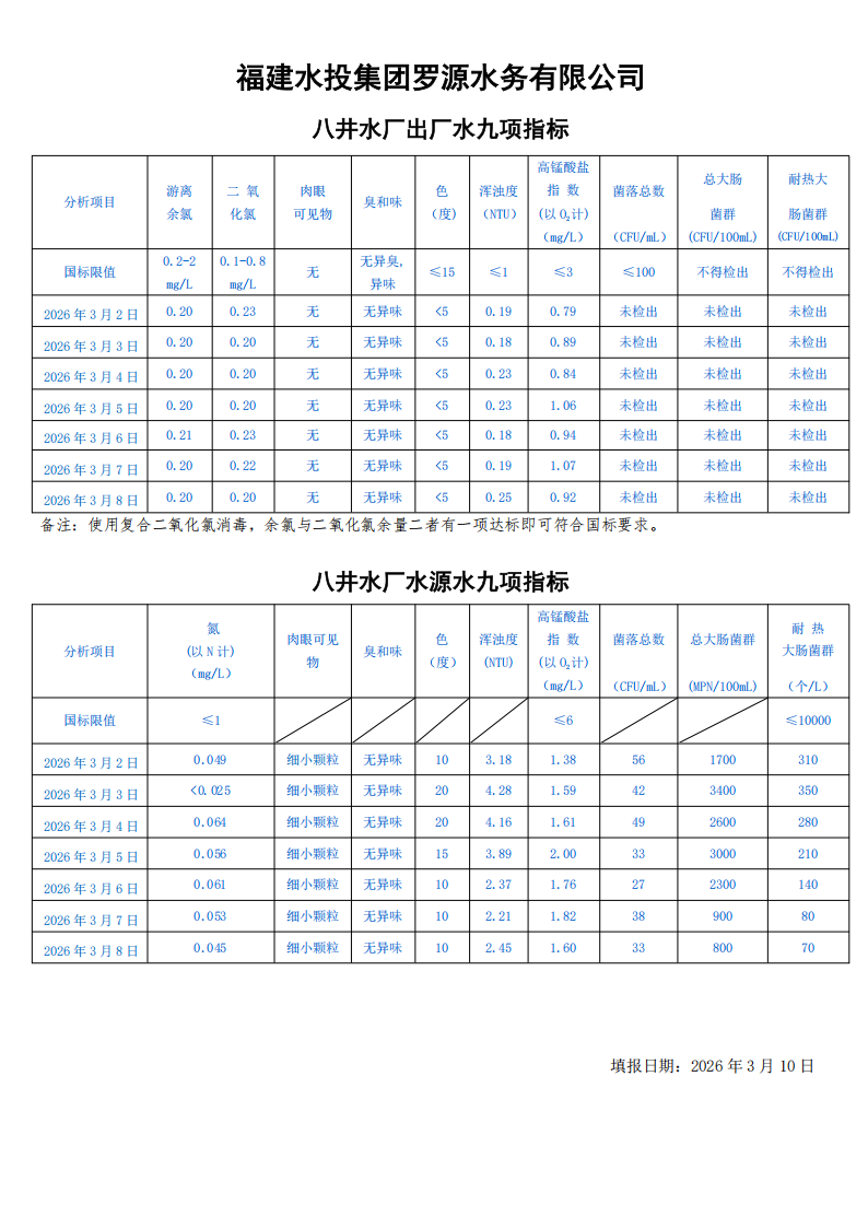 2026年3月2日-2026年3月8日八井水厂出厂水及水源水九项指标