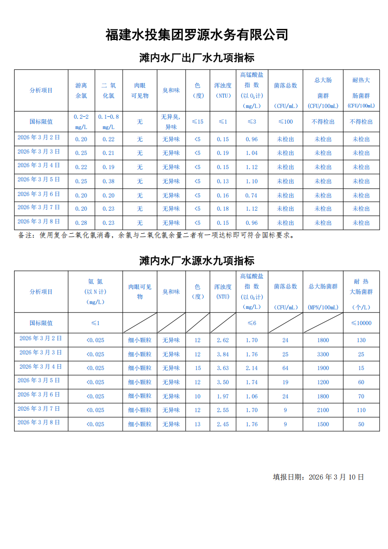 2026年3月2日-2026年3月8日滩内水厂出厂水及水源水九项指标